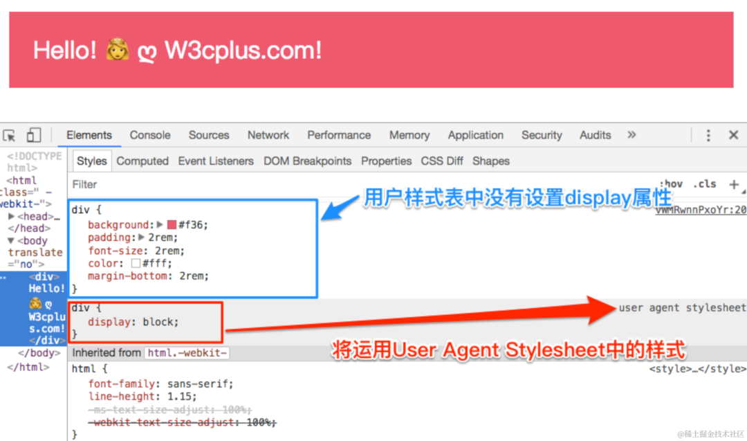 还是拿示例来说吧。比如我们一个 div 元素,我们并没有显式的在自己的样式表中设置其 display 属性的值。对于最后的渲染结果,浏览器将会使用用户代理规则的样式 display:block。