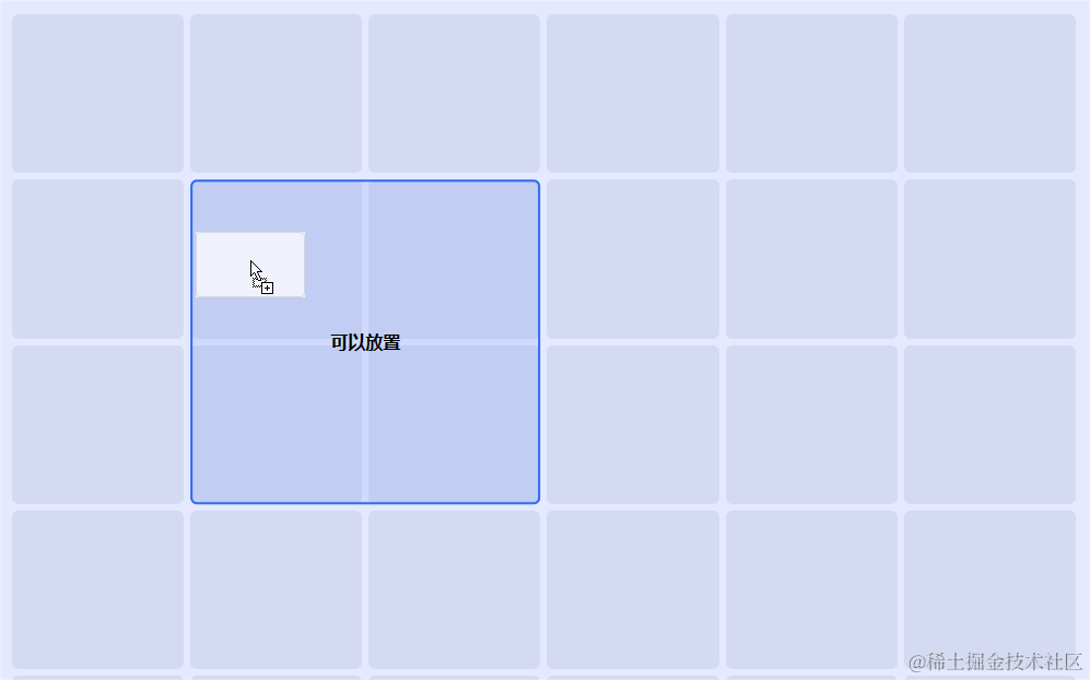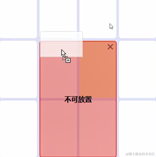 // 是否可以放置const isPutDown = computed(() => { const currentXy = [current.x, current.y, current.x + current.column, current.y + current.row]; return ( booleanWithin([0, 0, columnCount.value, rowCount.value], currentXy) && // list.value.every((item) => item.id === current.id || !booleanIntersects([item.x, item.y, item.x + item.column, item.y + item.row], currentXy)) );});拖拽时样式