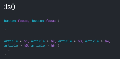 :is() CSS 伪类函数将选择器列表作为参数,并选择该列表中任意一个选择器可以选择的元素。