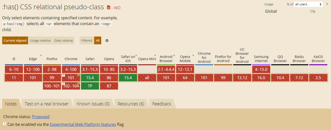 比较可惜的是,:has() 在最近的 Selectors Level 4[11] 规范中被确定,目前的兼容性还比较惨淡,截止至 2022-05-04,Safari 和 最新版的 Chrome(V101,可通过开启 Experimental Web Platform features 体验)