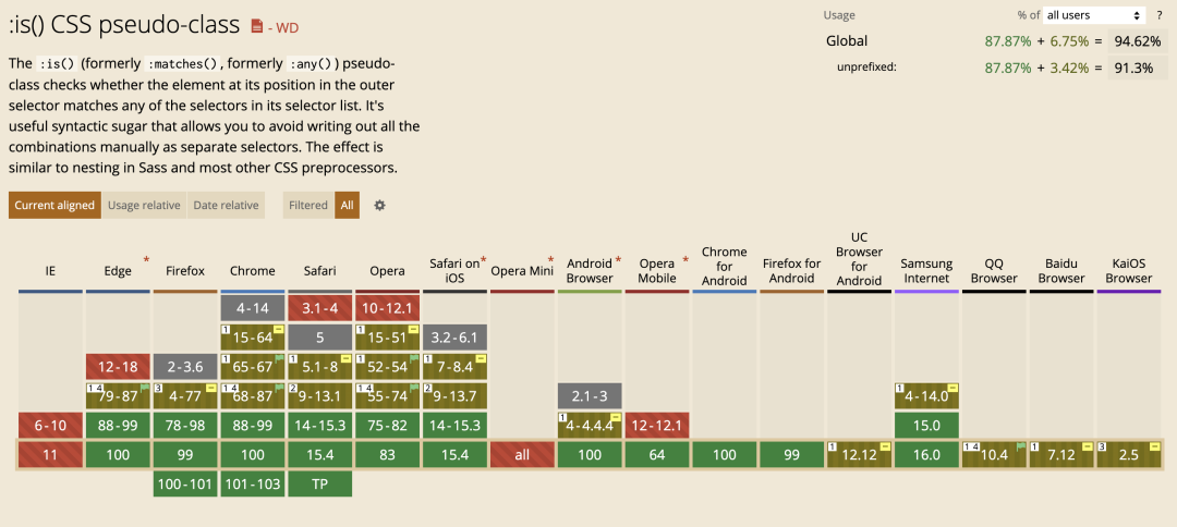 :is(div, p) span {}// 等同于:-webkit-any(div, p) span {}:-moz-any(div, p) span {}:matches(div, p) span {}当然,下面 3 个都已经废弃,不建议再继续使用。而到今天(2022-04-27):is() 的兼容性已经非常不错了,不需要兼容 IE 系列的话可以考虑开始用起来(配合 autoprefixer),看看 CanIUse[3]: