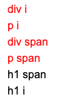 <div><i>div i</i></div><p><i>p i</i></p><div><span>div span</span></div><p><span>p span</span></p><h1><span>h1 span</span></h1><h1><i>h1 i</i></h1>如果要将上述 HTML 中,<div> 和 <p> 下的 <span> 和 <i> 的 color 设置为 red,正常的 CSS 可能是这样: