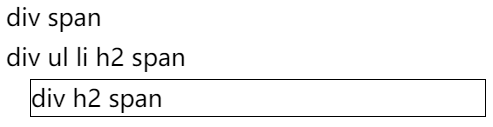 <div> <span>div span</span></div><div> <ul> <li> <h2><span>div ul li h2 span</span></h2> </li> </ul></div><div> <h2><span>div h2 span</span></h2></div>div:has(>h2>span) { margin-left: 24px; border: 1px solid #000;}这里,要求准确选择 div 下直接子元素是 h2,且 h2 下直接子元素有 span 的 div 元素。注意,选择的最上层使用 :has() 的父元素 div。结果如下: