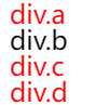 <div class="a">div.a</div><div class="b">div.b</div><div class="c">div.c</div><div class="d">div.d</div>div:not(.b) { color: red;}div:not(.b) 它可以选择除了 class 为 .b 元素之外的所有 div 元素:
