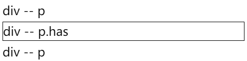 <div> <p>div -- p</p></div><div> <p class="g-test-has">div -- p.has</p></div><div> <p>div -- p</p></div>div:has(.g-test-has) { border: 1px solid #000;}我们通过 div:has(.g-test-has) 选择器,意思是,选择 div 下存在 class 为 .g-test-has 的 div 元素。