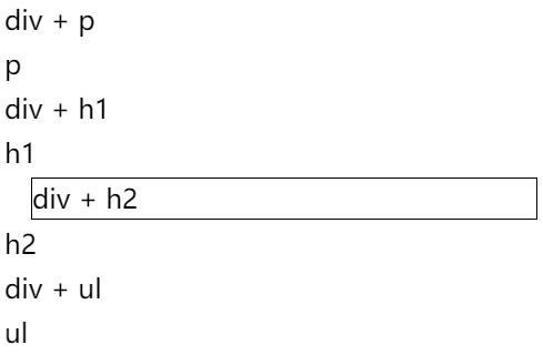 <div class="has-test">div + p</div><p>p</p><div class="has-test">div + h1</div><h1>h1</h1><div class="has-test">div + h2</div><h2>h2</h2><div class="has-test">div + ul</div><ul>ul</ul>我们想找到兄弟层级关系中,后面接了 <h2> 元素的 .has-test 元素,可以这样写: