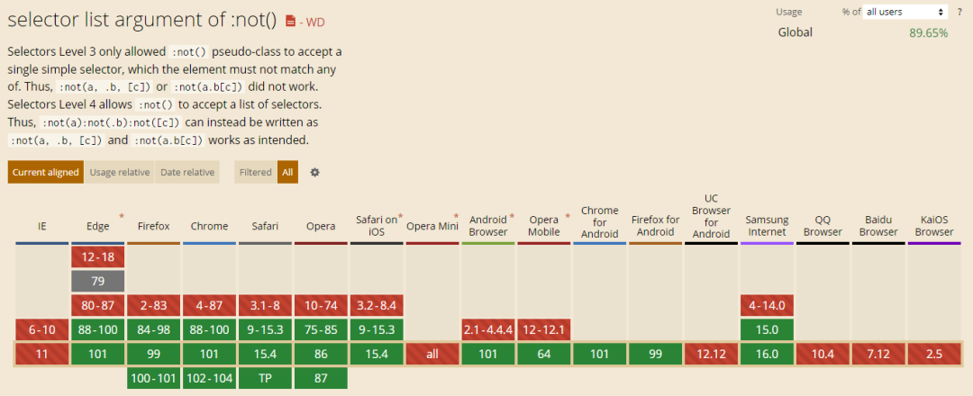 经历了 CSS Selectors Level 3 & CSS Selectors Level 4 两个版本,到今天(2020-05-04),除去 IE 系列,:not 的兼容性已经非常之好了: