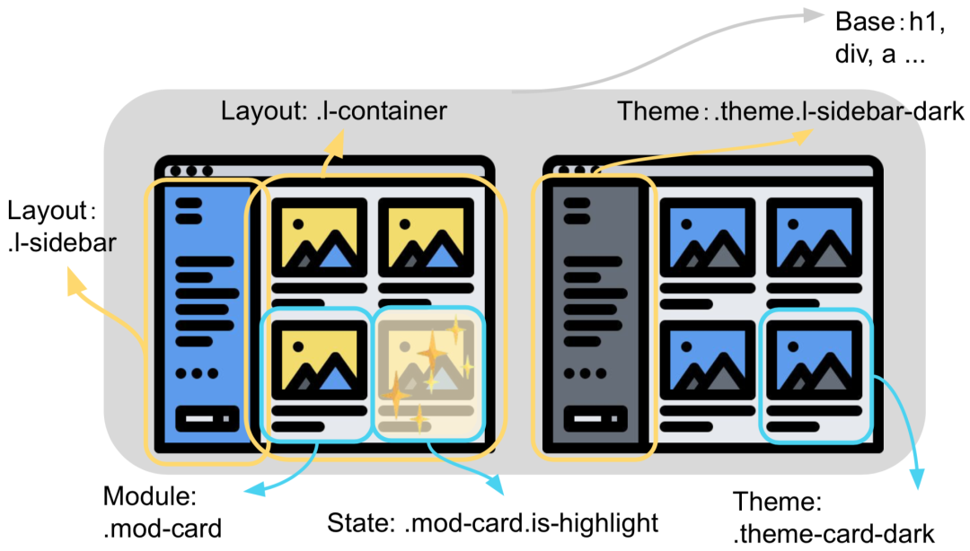 SMACSS 全称为 Scalable and Moduler Architecture for CSS,意为可扩展的模块化 CSS 结构,由 Jonathan Snook 提出。SMACSS 不仅包含了结构与样式分离的概念,还具有极具特色的结构化命名的概念。所谓的结构化命名,就是将元素做结构分类并限制其命名,以此达到易扩展和模块化的目的。