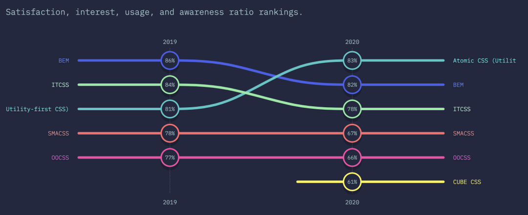 根据 State of CSS 2020 的调查结果显示,目前使用最多的五种分别为:BEM、ACSS、OOCSS、SMACSS、ITCSS。