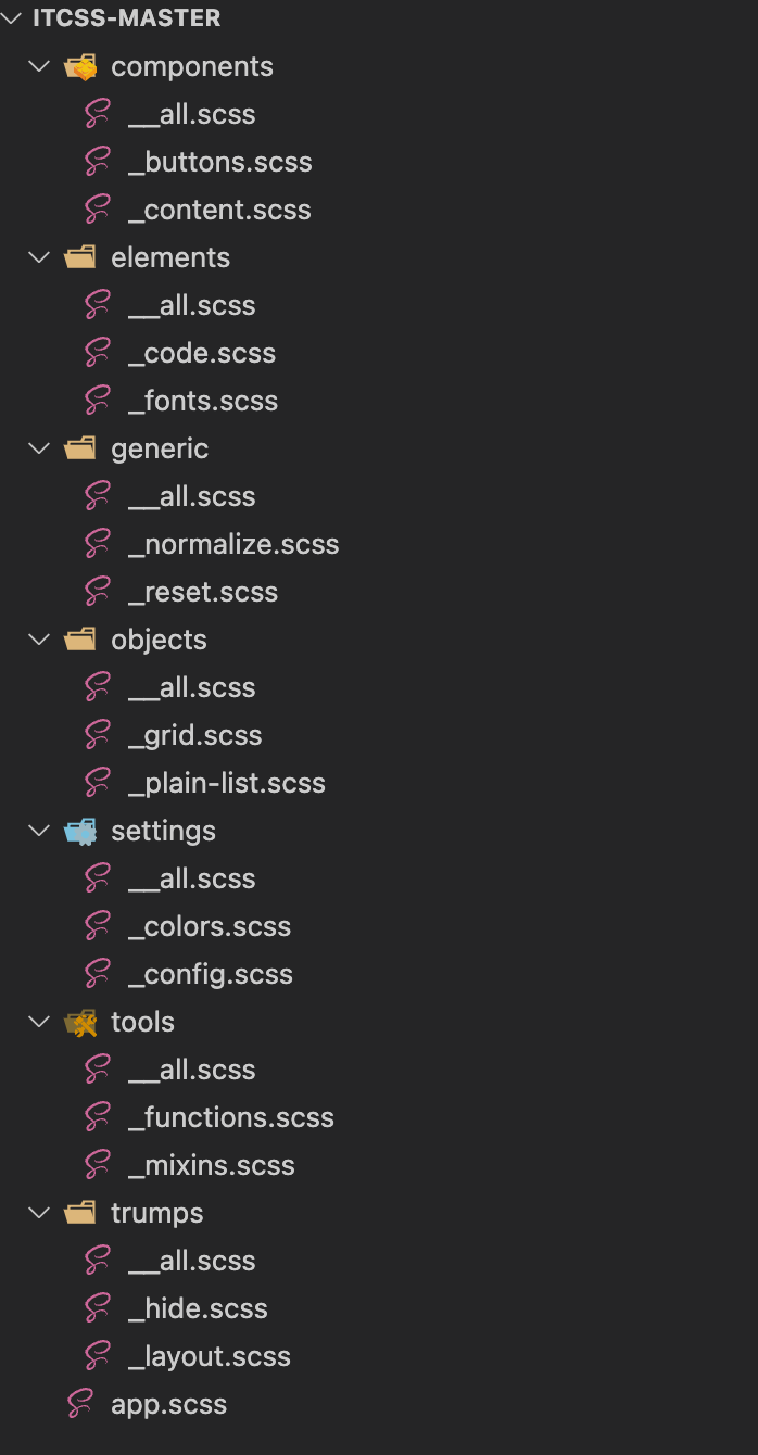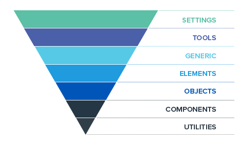 ITCSS 的目标是通过分层组织 CSS 文件,实现了自下而上的特异性。它基于分层的概念把项目中的样式分为七层: