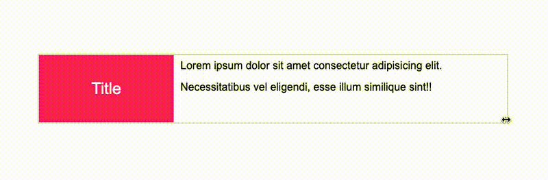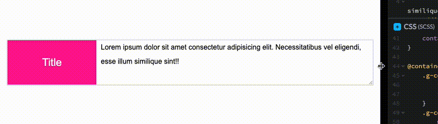 <div class="wrap"> <div class="g-container"> <div class="child">Title</div> <p>Lorem ipsum dolor sit amet consectetur adipisicing elit. Necessitatibus vel eligendi, esse illum similique sint!!</p> </div></div>.wrap { width: 500px; resize: horizontal; overflow: auto;}.g-container { display: flex; flex-wrap: nowrap;}.wrap { /* CSS CONTAINER */ container-name: wrap; container-type: inline-size;}@container wrap (max-width: 400px) { .g-container { flex-wrap: wrap; flex-direction: column; }}像是这样,我们通过 resize: horizontal 来模拟单个容器的宽度变化,在这种情况下,容器查询能够做到在不同宽度下,改变容器内部的布局。