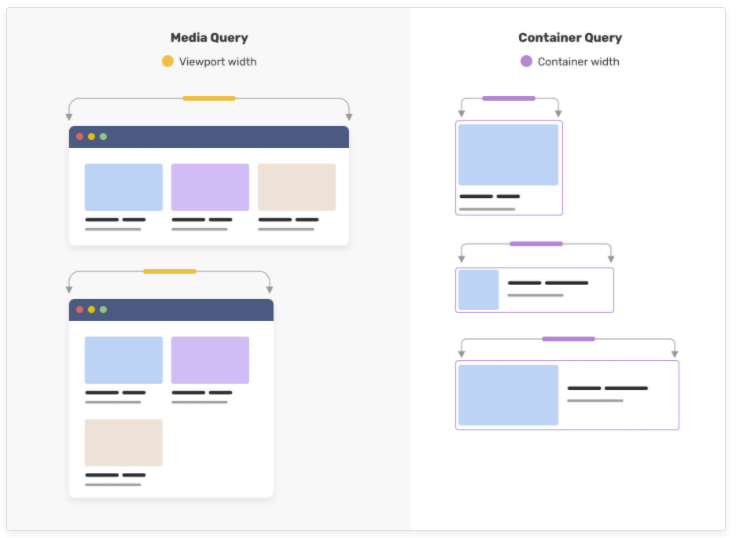 媒体查询与容器查询的异同,通过一张简单的图看看,核心的点在于容器的宽度发生变化时,视口的宽度不一定会发生变化: