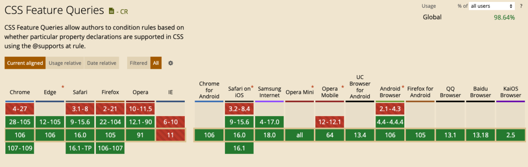 Can i use(更新至 2022/10/13): _http://caniuse.com/#search=%40supports_