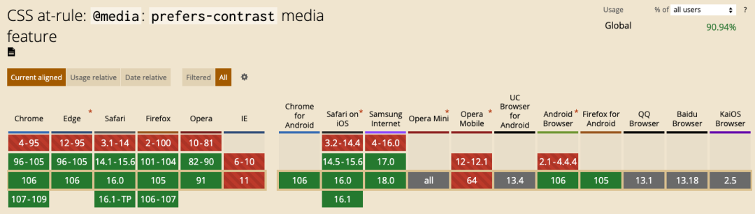 .ele { opacity: 0.5;}// 减少透明元素@media (prefers-contrast: reduce) { .ele { opacity: 1; }}我在上一次,介绍这个功能的时候,它还是一片红色,但是短短半年,整个兼容性已经有了很大的提升!