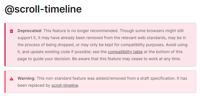 意思是,即便目前有一些浏览器已经支持了 @scroll-timeline,但是它很快又将要退出历史舞台。不再建议再使用这个 at-rule 规则。