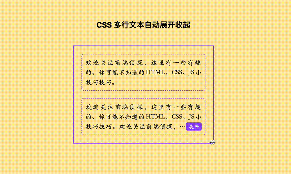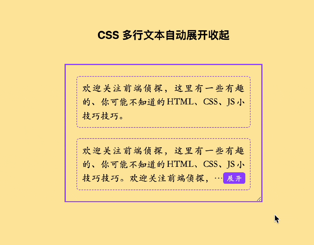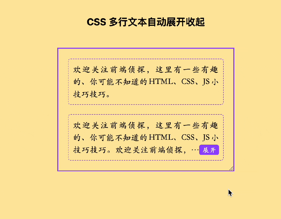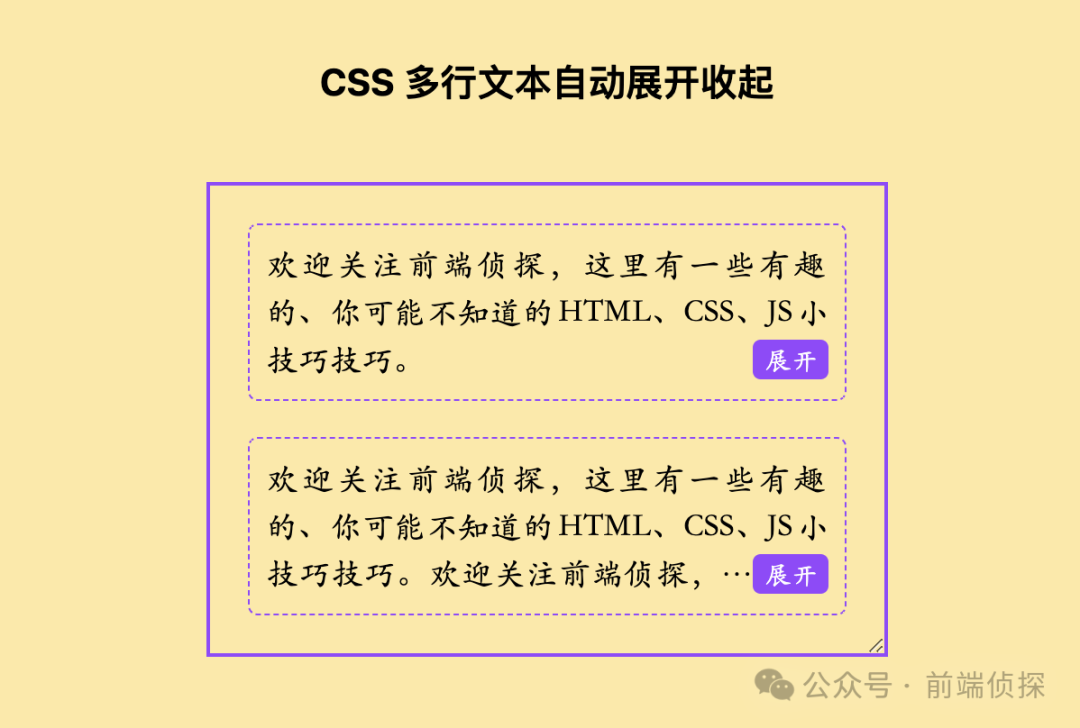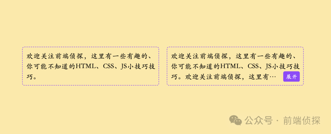 <div class="text-wrap"> <div class="text-content"> <label class="expand"><input type="checkbox" hidden></label> 欢迎关注前端侦探,这里有一些有趣的、你可能不知道的HTML、CSS、JS小技巧技巧。 </div></div>相关 CSS 如下