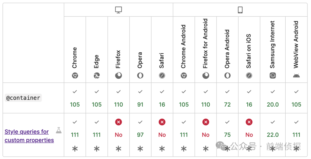 <style> div{ color:red; } @container style(color: red) { p { background: black; } }</style><div> <p> </p></div>有人可能会有疑问,为啥要设置子元素,直接设置本身不好吗?其实是为了避免冲突,假设查询到了color:red,然后你又设置了color:yellow,那浏览器该如何渲染呢?有点死循环了。所以为了避免这种情况,所有容器查询都只能设置子元素样式。