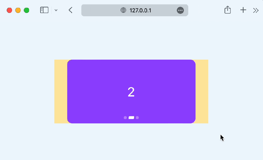 <div class="swiper-container" style="timeline-scope: --t1,--t2,--t3;"> <div class="swiper" style="--t: --t1"> <div class="swiper-item"> <div class="card">1</div> </div> <div class="swiper-item" style="--t: --t2"> <div class="card">2</div> </div> <div class="swiper-item" style="--t: --t3"> <div class="card">3</div> </div> </div> <div class="pagination"> <i class="dot" style="--t: --t1"></i> <i class="dot" style="--t: --t2"></i> <i class="dot" style="--t: --t3"></i> </div></div>然后,给每个指示器添加一个动画