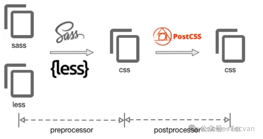 CSS 后处理器:接收标准 CSS 代码作为输入,然后通过添加浏览器前缀、优化 CSS 规则、压缩代码等方式来优化这些 CSS。后处理器的主要目标是确保 CSS 兼容各种浏览器,并优化 CSS 的性能和效率。通常作为构建流程的一部分,与任务运行器(如 Webpack、Vite 等)一起使用,常见的 CSS 后处理器包括 PostCSS 和 Autoprefixer。