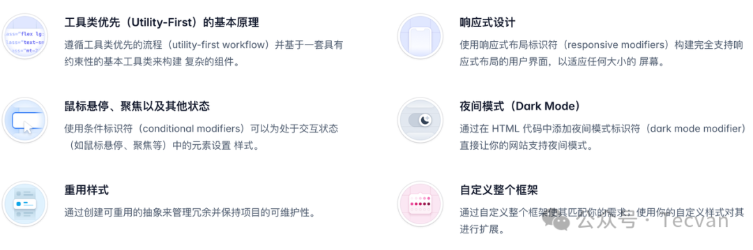 Tailwind CSS 是一个强大且灵活的框架,其核心设计是提供了一种全新的方式来构建用户界面,核心思想是通过使用预设类和定制功能,能够让开发者更专注在实现设计效果上,不再处理重复冗长的 CSS 文件,用最少 CSS 快速地创建出美观且响应迅速的网页,以下是摘自 Tailwind CSS 官网的介绍: