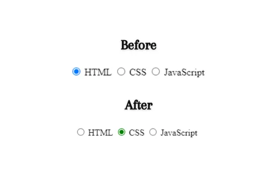 <form> <input type="radio" id="html" /> <label for="html">HTML</label> <input type="radio" id="css" /> <label for="css">CSS</label> <input type="radio" id="js" /> <label for="js">JavaScript</label></form>CSS: