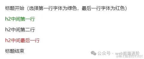 <h2>标题开始(选择第一行字体为绿色,最后一行字体为红色)</h2>