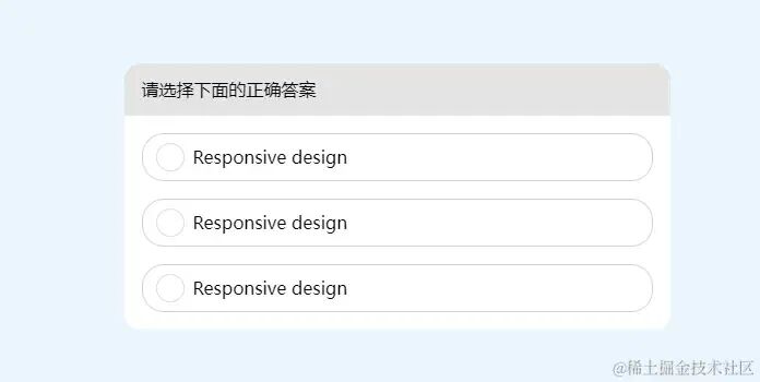 <label for="option3">Responsive design</label>选择错误选项时,标红当前选项。选择正确选项时标绿当前选项。