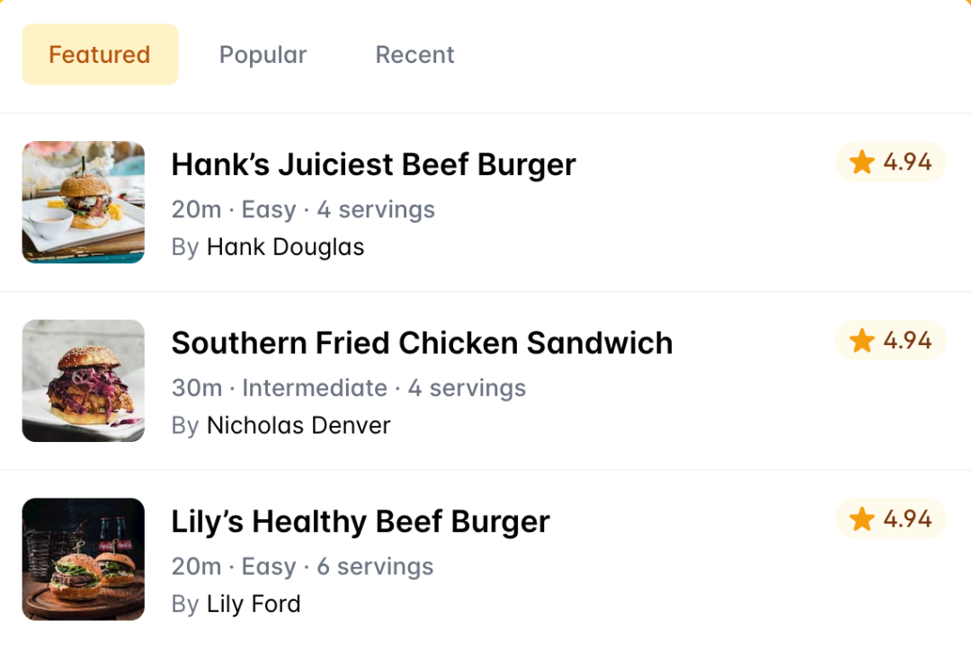 // Recipes.jsimport Nav from './Nav.js'import NavItem from './NavItem.js'import List from './List.js'import ListItem from './ListItem.js'export default function Recipes({ recipes }) { return ( <div class>Recent</NavItem> </Nav> <List> {recipes.map((recipe) => ( <ListItem key={recipe.id} recipe={recipe} /> ))} </List> </div> )}// Nav.jsexport default function Nav({ children }) { return ( <nav class> {children} </ul> </nav> )}// NavItem.jsexport default function NavItem({ href, isActive, children }) { return ( <li> <a href={href} className={`block px-4 py-2 rounded-md ${isActive ? 'bg-amber-100 text-amber-700' : ''}`} > {children} </a> </li> )}// List.jsexport default function List({ children }) { return ( <ul class> {children} </ul> )}//ListItem.jsexport default function ListItem({ recipe }) { return ( <article class> <img src={recipe.image} alt="" class> {recipe.title} </h2> <dl class>Time</dt> <dd> <abbr title={`${recipe.time} minutes`}>{recipe.time}m</abbr> </dd> </div> <div> <dt class>Difficulty</dt> <dd> · {recipe.difficulty}</dd> </div> <div> <dt class>Servings</dt> <dd> · {recipe.servings} servings</dd> </div> <div class>By</dt>{' '} <dd class>{recipe.author}</dd> </div> <div class="absolute top-0 right-0 rounded-full bg-amber-50 text-amber-900 px-2 py-0.5 hidden sm:flex lg:hidden xl:flex items-center space-x-1"> <dt class /> </svg> </dt> <dd>{recipe.rating}</dd> </div> </dl> </div> </article> )}上述食谱的效果如下: