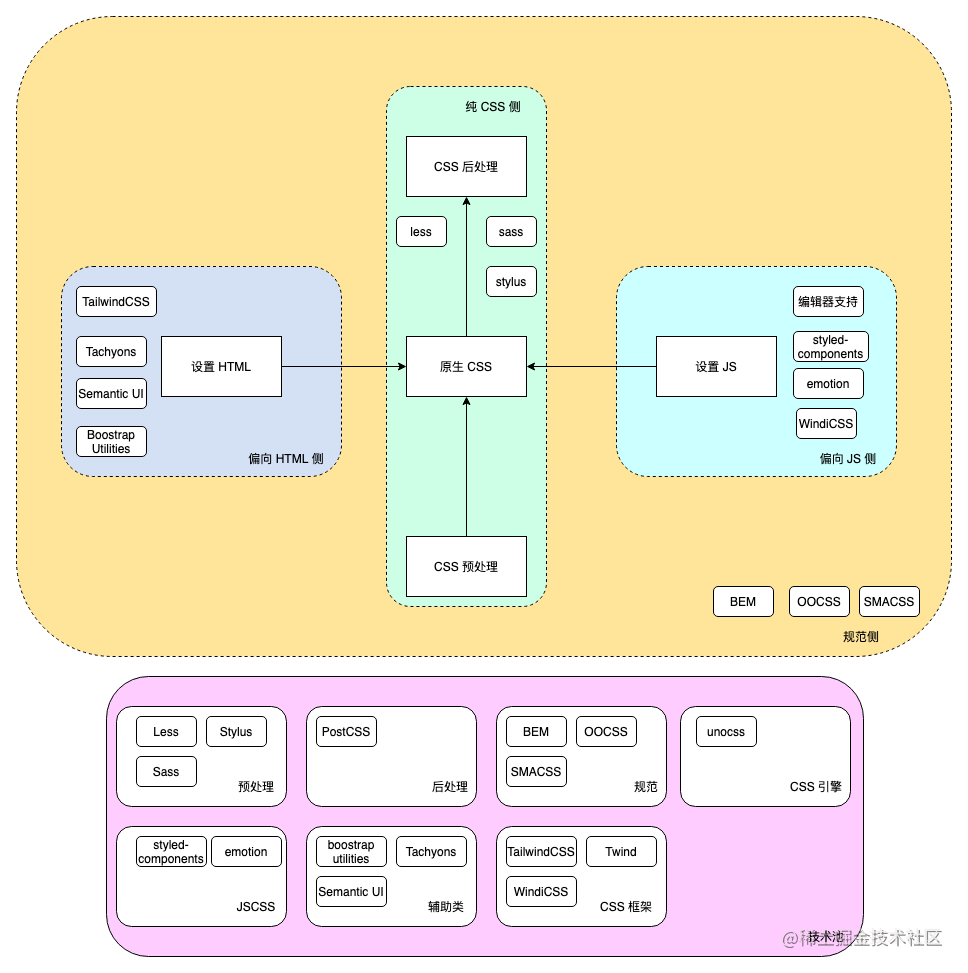 目前整个 CSS 工具链、工程化领域的主要方案如下:
