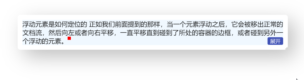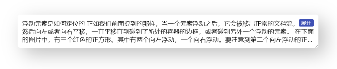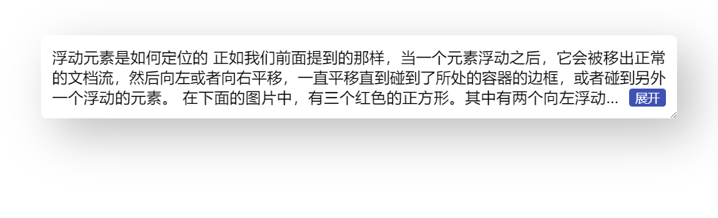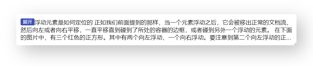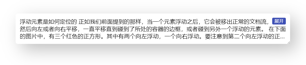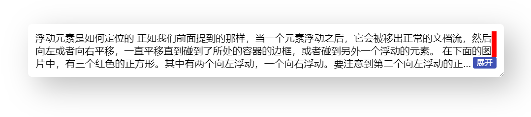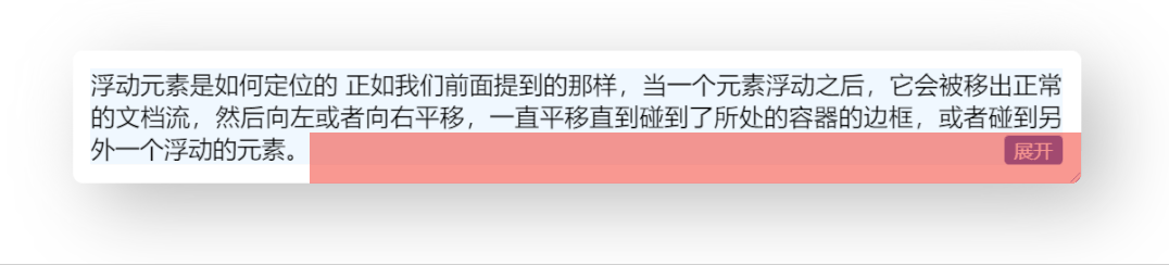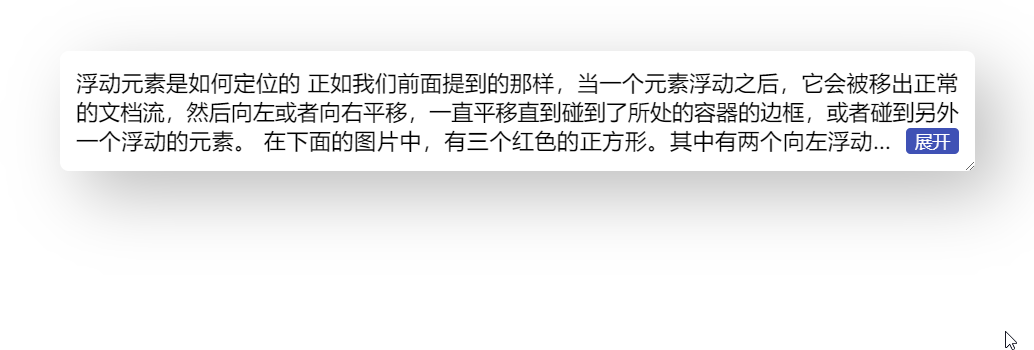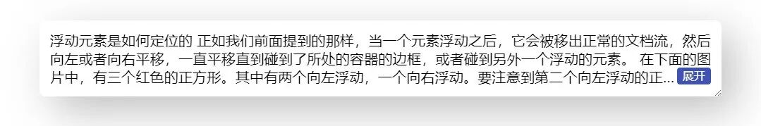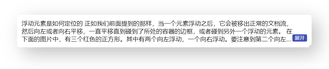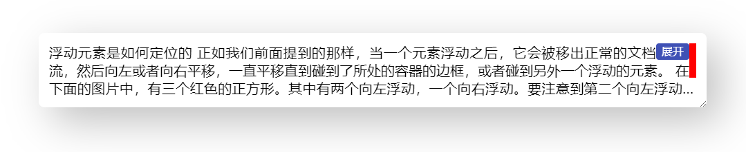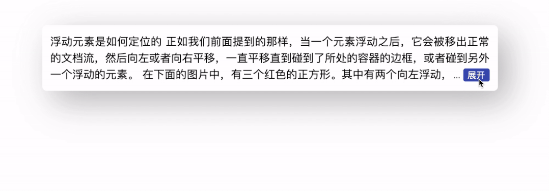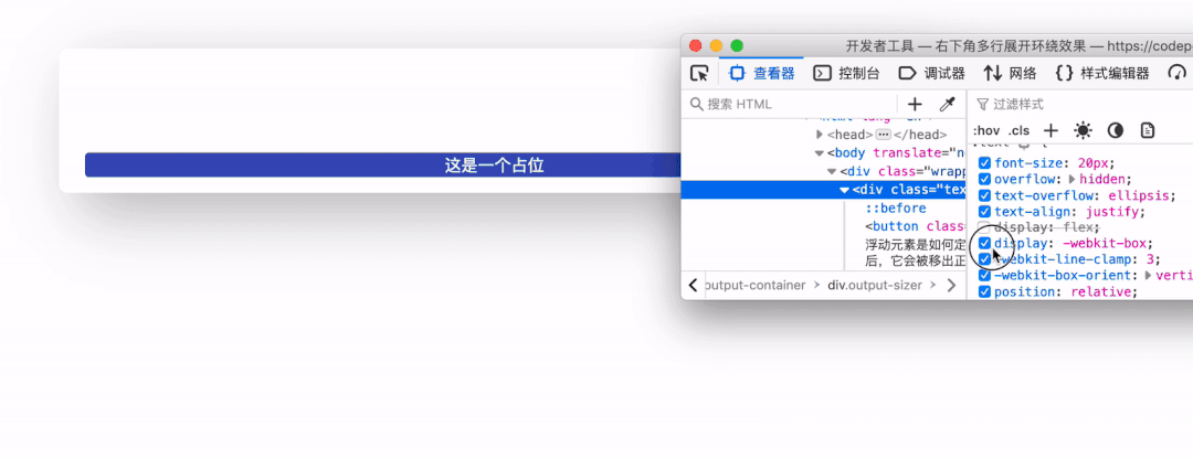}到这里,右下角环绕的效果就基本完成,省略号也是位于展开按钮之前的,完整代码可以查看 codepen 右下角多行展开环绕效果 [3]
