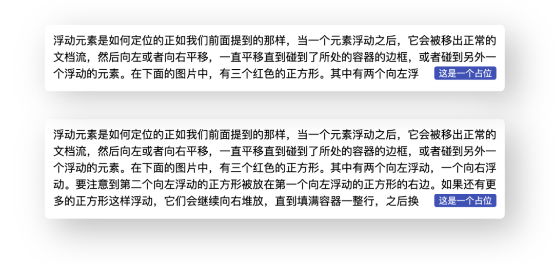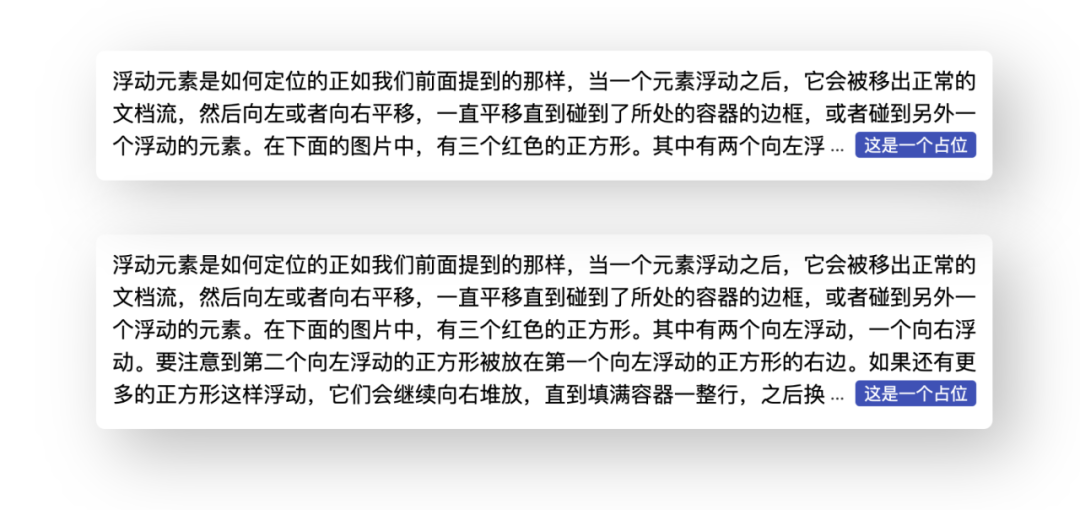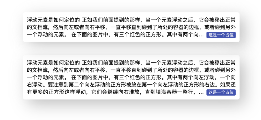 }可以看到,现在文本是完全环绕在右侧的两个浮动元素了,只要把红色背景的伪元素宽度设置为 0(或者不设置宽度,默认就是 0),就实现了右下角环绕的效果