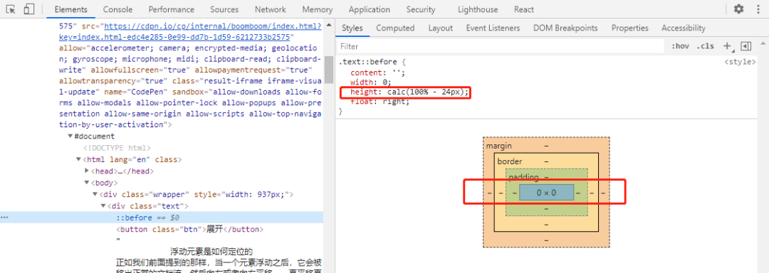 }很可惜,好像并没有什么效果,打开控制台看看,结果发现 calc(100% - 24px) 计算高度为 0