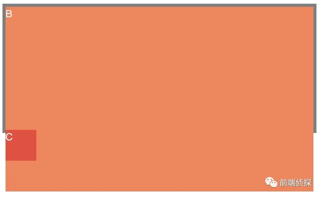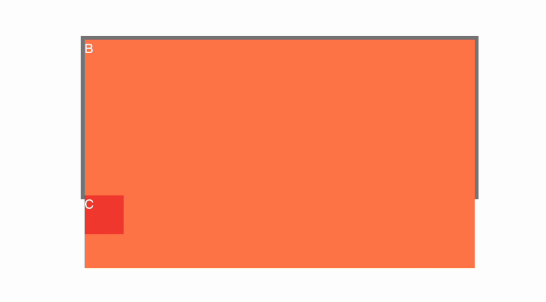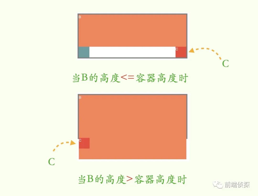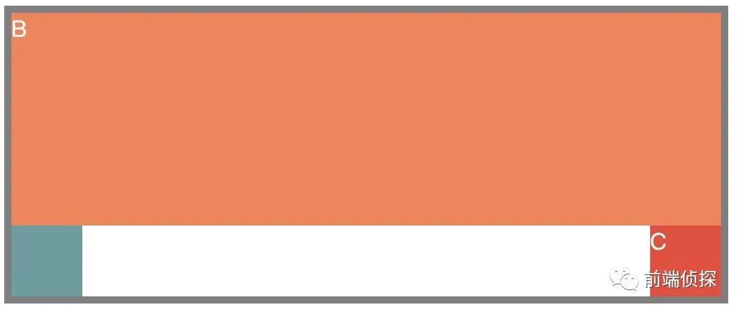 此时,B的高度不高于A,所以C仍然是贴在B的下方,并且靠右。现在让B的高度超过A,也就是超出容器高度,就变成了这样