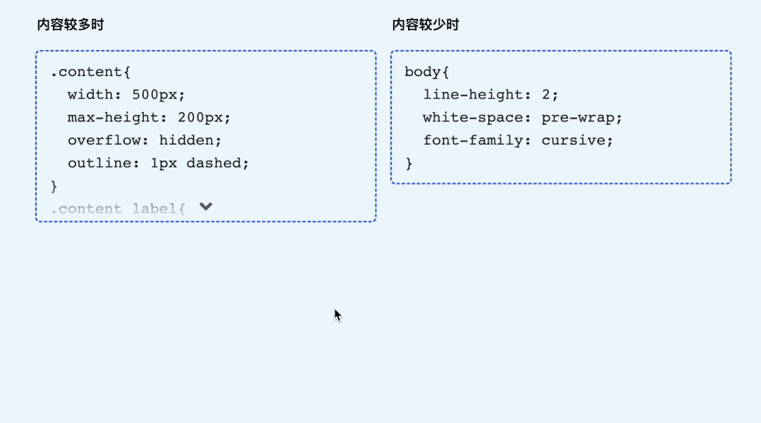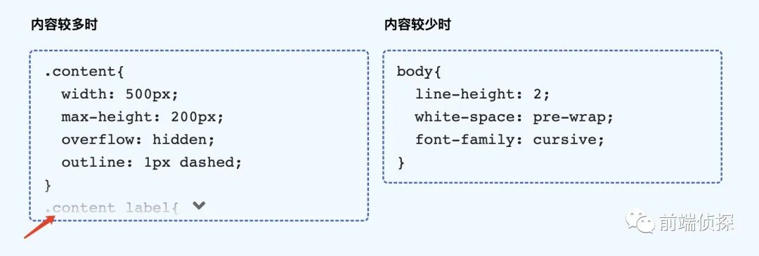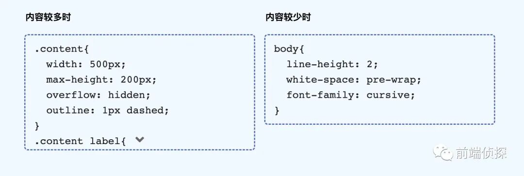 <div class="section"> <input class="content-check" type="checkbox" id="c1" hidden> <div class="content"> <pre class="text"> 很多内容... 很多内容... </pre> <label for="c1" class="btn"></label> </div></div>然后加点样式美化一下吧,由于原理和前面是完全一致的,这里就不重复展示具体细节了