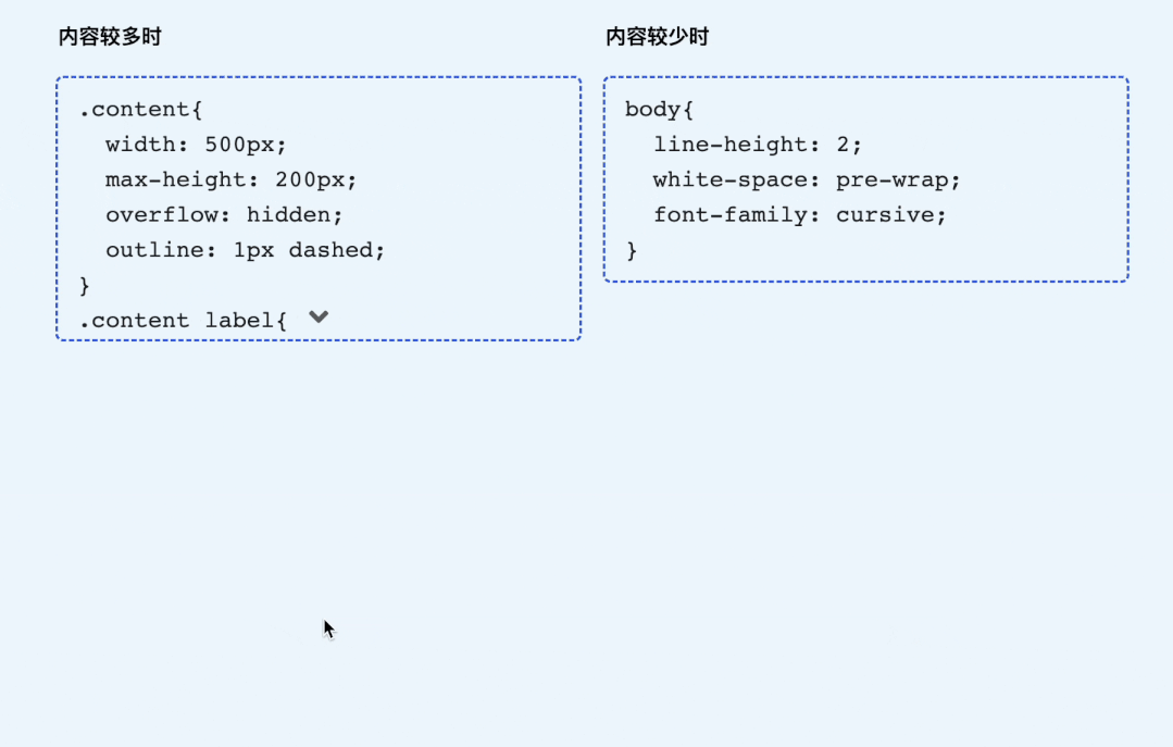 .content-check:checked+.content{ max-height: fit-content;}.content-check:checked+.content .btn{ left: auto; right: calc(50% - 50px);}.content-check:checked+.content .btn::after{ transform: scaleY(-1);}这样就可以控制不同的状态了