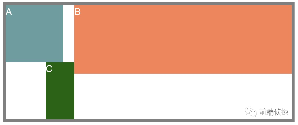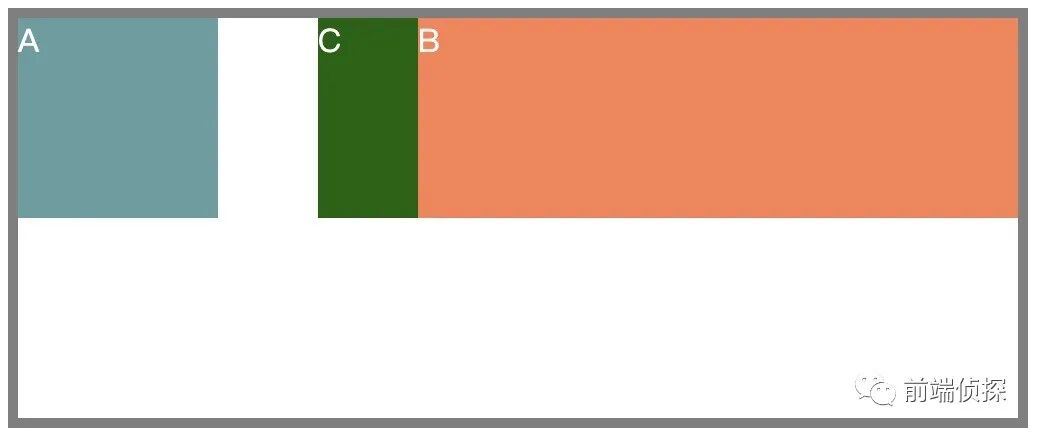 <div class="box"> <div class="a">A</div> <div class="b">B</div> <div class="c">C</div></div>.a{ width: 100px; height: 100px; float: left; background-color: cadetblue;}.b{ width: 300px; height: 100px; float: right; background-color: coral;}.c{ width: 50px; height: 100px; float: right; background-color: darkgreen;}当横向空间足够时,效果是这样的
