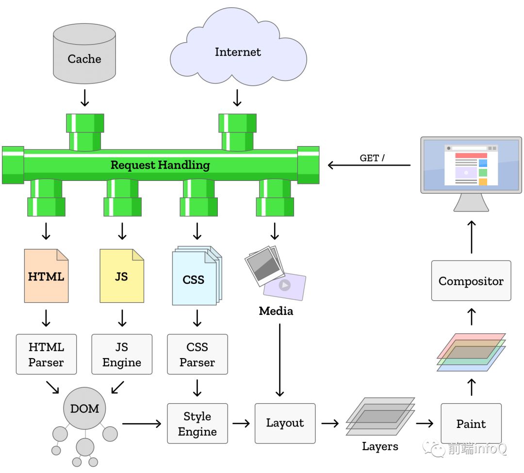 渲染引擎,解析 DOM 文档和 CSS 规则并将内容排版到浏览器中显示有样式的界面,也就是排版引擎,我们常说的浏览器内核主要指的就是渲染引擎。