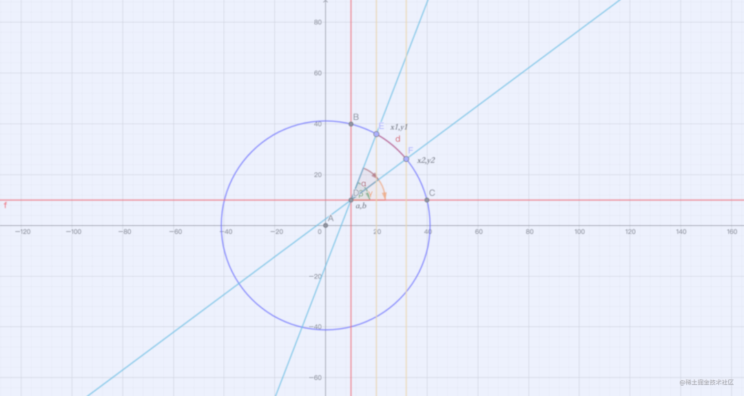 假设存在点 E 移动至点 F。设 E 坐标为 (x1, y1),F 坐标为 (x2, y2),D 坐标为 (a, b)。