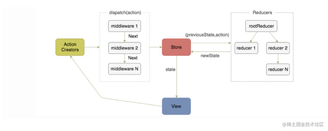 而且 redux 这种思路是函数式的思想,每个 reducer 都是输入和输出一一对应的纯函数,返回的 state 都是全新的,为了方便创建新的 state,一般会搭配 immutable 库,只要修改属性就会返回新的 state 对象。
