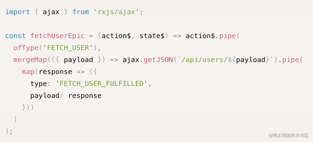 redux-observable 则是结合 rxjs 的方案了,把 action 变成数据源,经历层层 opreator 的处理,最后传递到 store。可以用 rxjs 生态大量的 oprator,做下组装就行,根本不用自己写异步逻辑的具体实现。