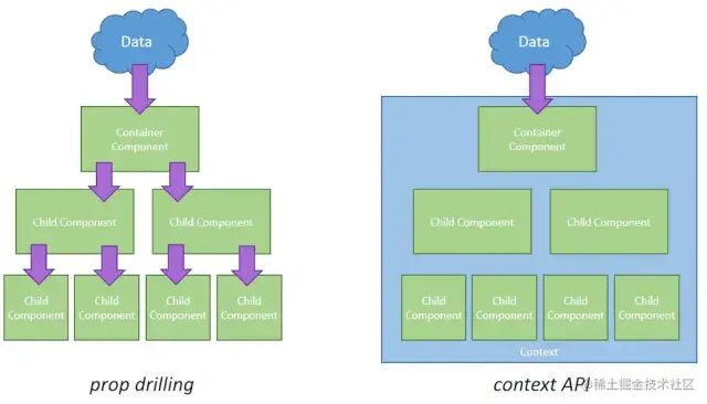 Provider:React Context 通过 Provider 包裹组件,被包裹的所有嵌套子组件都可以不用通过属性下钻而是通过 context 直接获取状态。