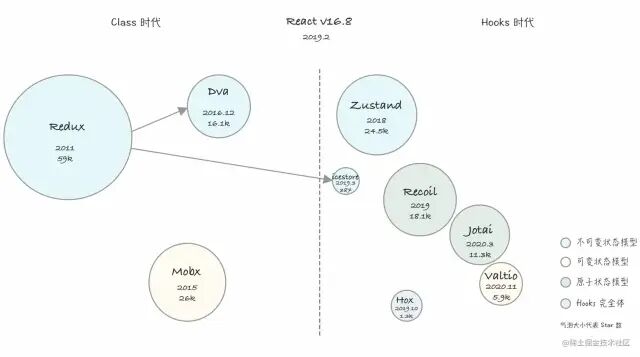 将以上状态管理库按心智模型、诞生时间、star 数,绘制气泡图。以 React v16.8 版本为分水岭,状态管理库可分为 Class 时代和 Hooks 时代。Class 时代中 Redux 和 Mobx 都是非常优秀的状态库。随着 Hooks 时代的到来,状态管理的心智模型也逐步发生着演变。整体呈现从中心化到去中心化,从单一状态到原子状态,从 Provider 到拥抱 Hooks 等演变趋势。