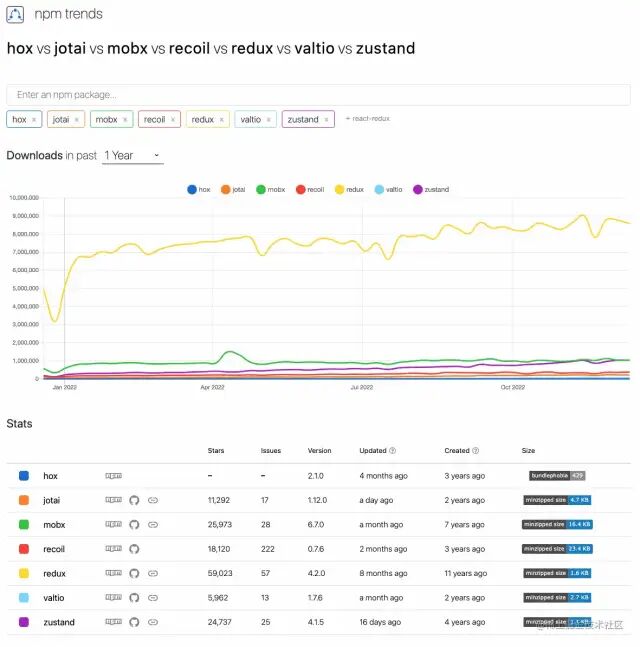 我们可以看到 Redux 作为 React 状态管理的老大哥,下载量上依然遥遥领先其他库。Mobx 作为往年热度仅次于 Redux 的状态管理库,位置正逐步有被 zustand 超越的趋势。recoil/jotai/valtio 作为这两年热门的新兴库热度也在逐步上升。hox 则处于不温不火的尴尬地位。