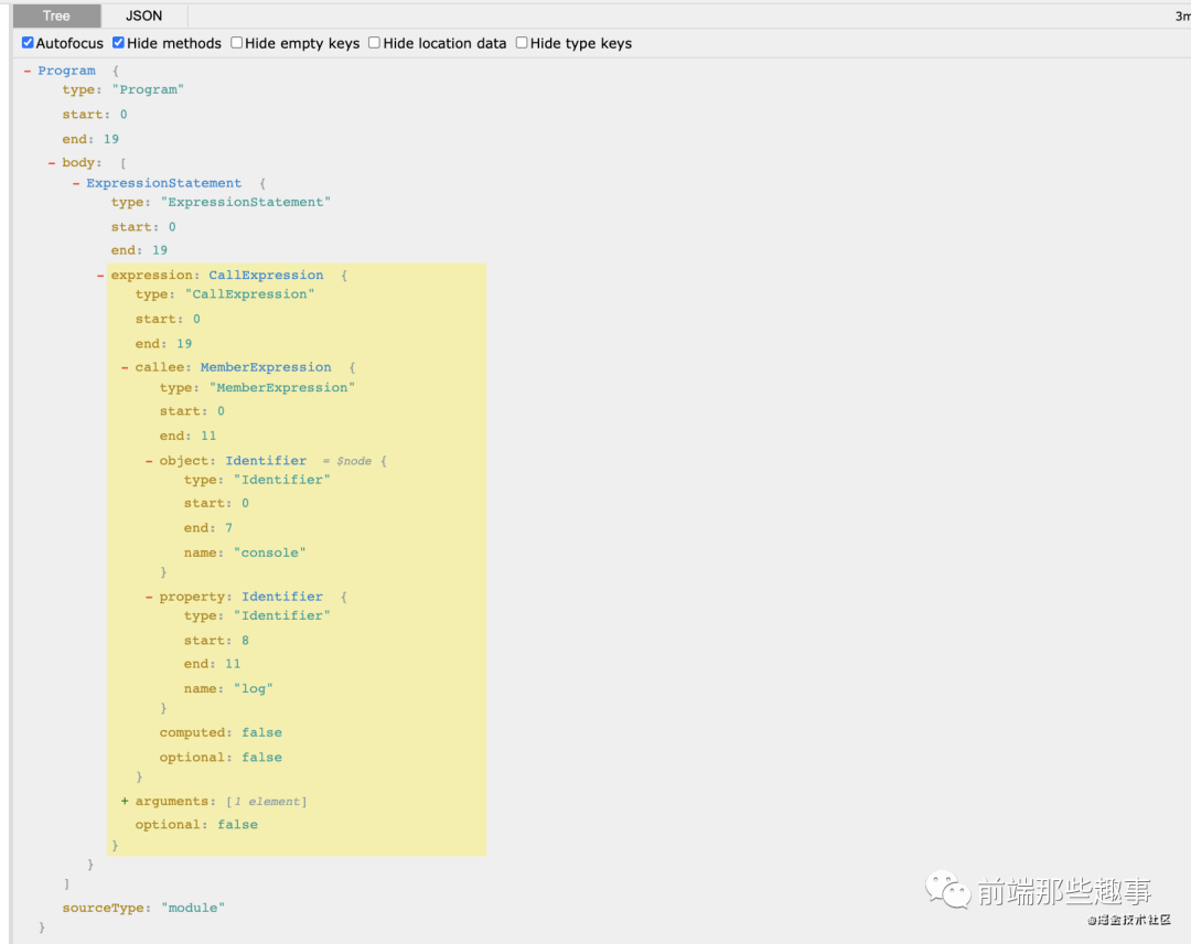 通过上图我们可以清晰的看到 console.log()是属于 ExpressionStatement(表达式语句) 中的 CallExpression(调用语句),可以通过 callee 属性中的 object 来判断是否为console, 同时也可以利用其 property 属性来判断是 console 的哪种方法,比如log、info等