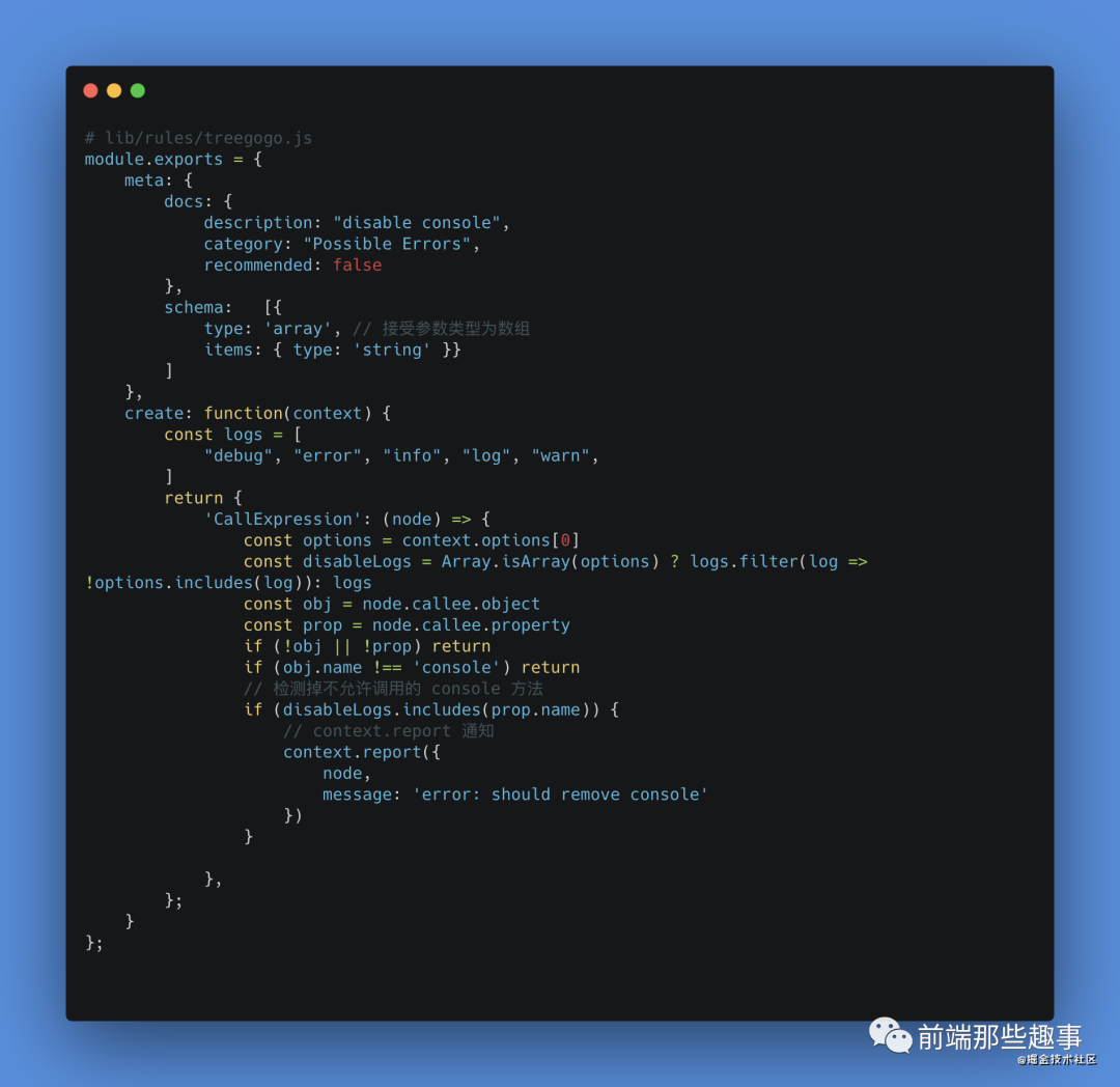 so~ 我们开始造玩具, 我们通过在 create 返回的对象中,定义一个 CallExpression 方法,当 ESLint 开始对 esTree 遍历时,通过对调用语句的监听,来检查该调用语句是否为 console 调用,代码如下 👇