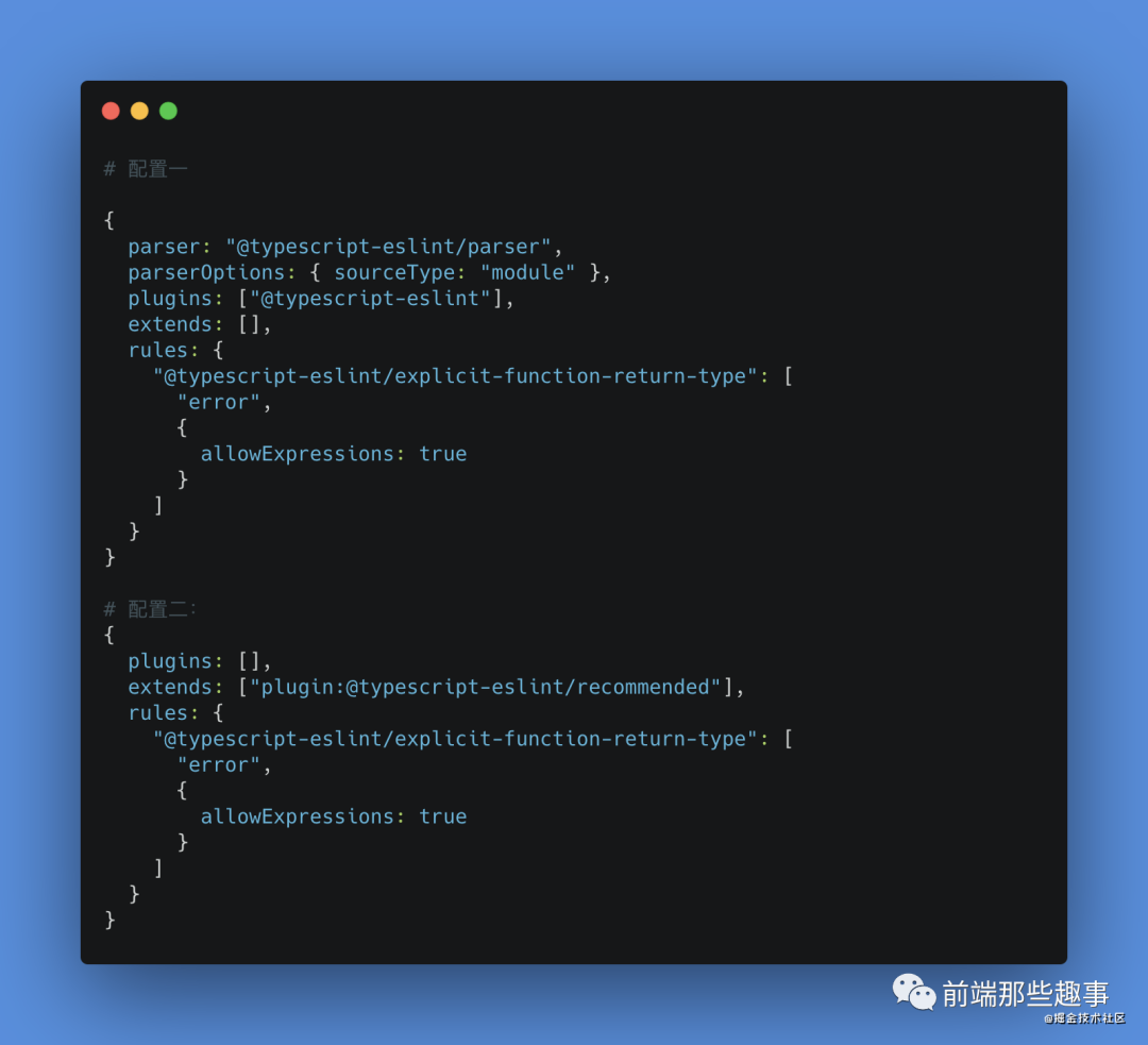 上图我们通过上面这个配置例子,我们可以看到要么是plugins:[]要么是extends:[],通过上图所示的配置二相对于配置一少了parser, parserOptions 和 plugins 等的信息配置,但其实这两个配置最终实现的结果是一致的,这是因为配置二中定义的 extends:plugin:@typescript-eslint/recommended 会自动加载上述提到的其他几个配置信息
