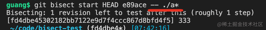 这里我加了两个参数,就是指定了 bad、good 的 commit 的意思,这样就可以直接开始二分了。