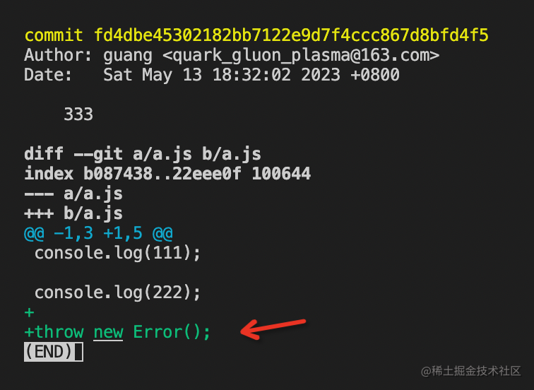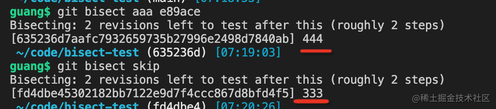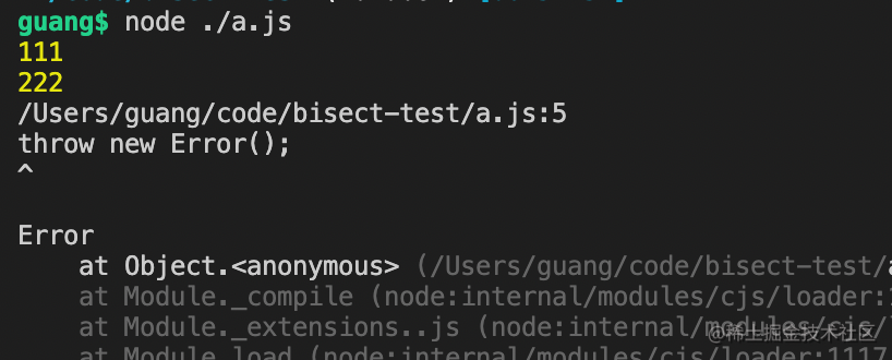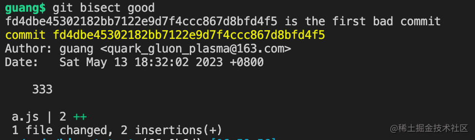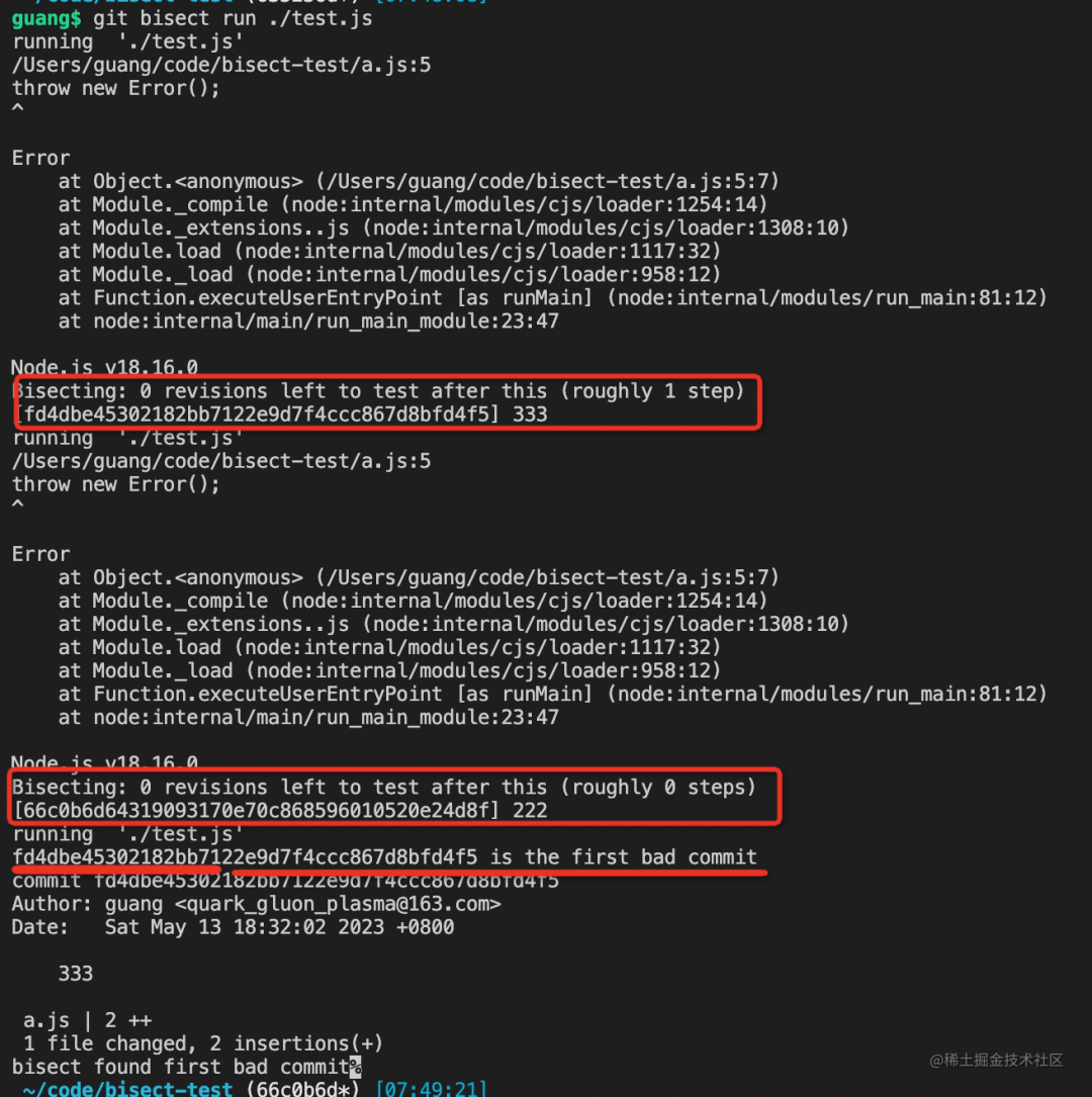 可以看到,444 跑脚本报错了,然后回到 333 跑, 还是报错,然后去 222 跑,这是不报错了,就定位到了第一个出错的是 333 这个 commit。
