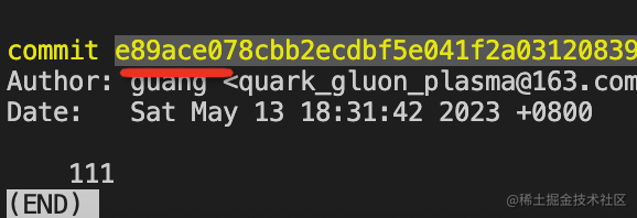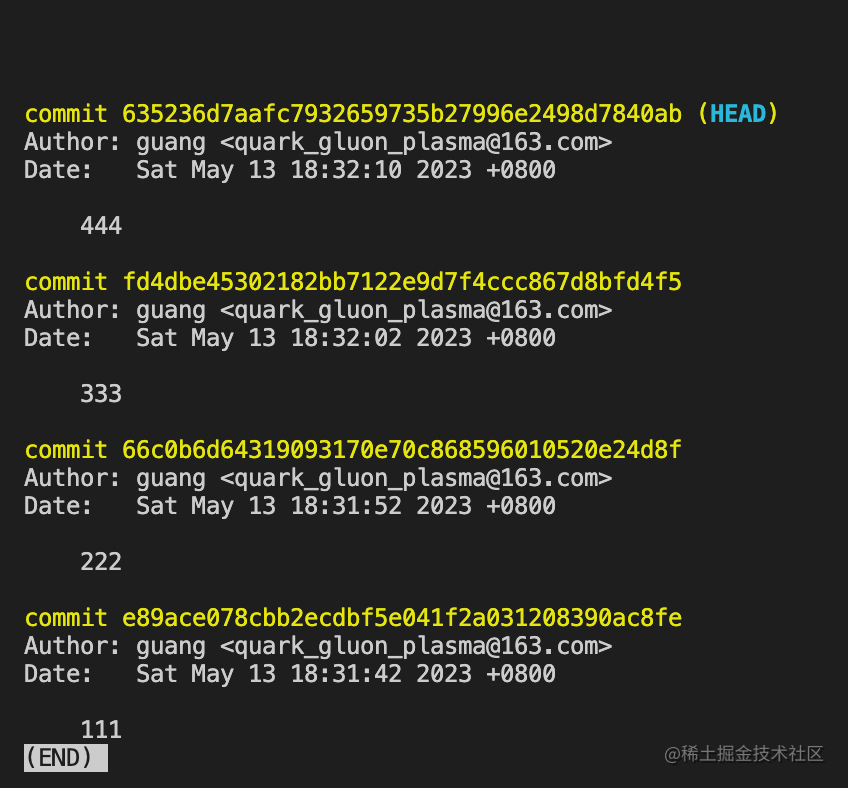 这时候 git log 可以看到已经切换到 444 的 commit。