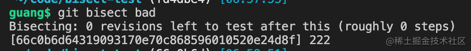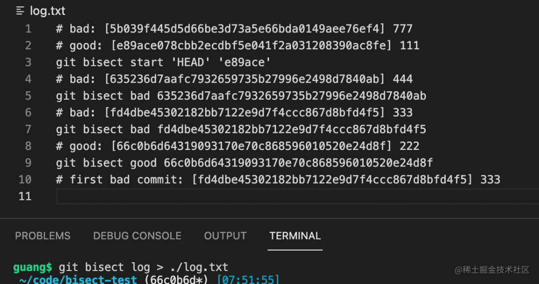我们可以执行 git bisect log 回顾下整个查找过程: